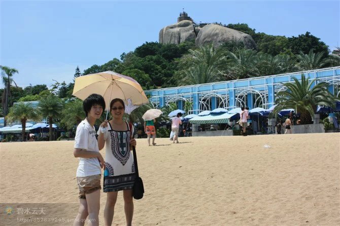 . z) y; s0 V4 r7 e' q0 P; x 终于又见到了海!我们没有去快艇上感受风浪,而是在坡缓沙细的海滩上沐足淘沙,身后的日光岩和精致的蓝色房子也无暇顾及,阳光是这么炫目!海水是这么沁凉!一群一群的游人嬉笑着、追赶着、打闹着,给这沙滩带来无限的活力。金黄的细沙安抚着我的脚背,咸腥的海风亲吻我的脸颊,我和女儿站在水中,任一波又一波的潮水漫过我们的小腿,打湿衣襟..........2 H0 o* ^- V* i4 b, h" D. ^