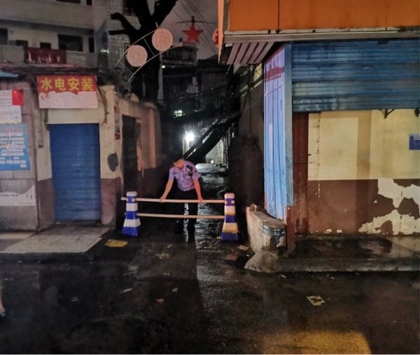 6 }, Q% M) b. c* m, `5 o 民警立即将民房内的群众疏散到安全地带、并在巷子的两头路口处拉起警戒线,防止群众路过被砸伤。随即,向上级报告此情况,紧急联系林业局、电力局及社区街道派工作人员到现场支援,共同开展处置工作。21时50分许,电力局的工作人员赶到现场处置,民警同社区人员一同清理现场,电力局将现场周边电缆拆除,准备将大树移走后再恢复供电。报警人称担心还有危险,该所民警一直在现场维持秩序,并排查周边环境,消除安全隐患,防止意外发生。