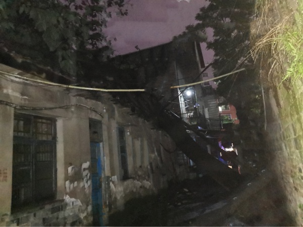 6月28日20时,衡阳市公安局蒸湘分局蒸湘北路派出所接到居民报警:“刚才突然下暴雨,又刮一阵阵的大风,家旁边那棵大树倒下来压在我们房子上,电线也被扯倒过来,我们现在很害怕,很需要你们帮助!” 接警后,该所民警王明水带领辅警谢静、阳恒、罗元明迅速赶到现场,现场位于衡阳市蒸湘区易赖西街逸夫小学左侧围墙边上,一棵直径约90公分的大树被暴风雨刮倒,倒在了逸夫小学左侧一门房屋顶上,大树在被刮倒的过程中,带倒了旁边一根电线杆,电线杆上是4根380伏的高压电线,高压电线也被大树挂到在门房的屋顶上。万幸的是,未发现有人员受伤。